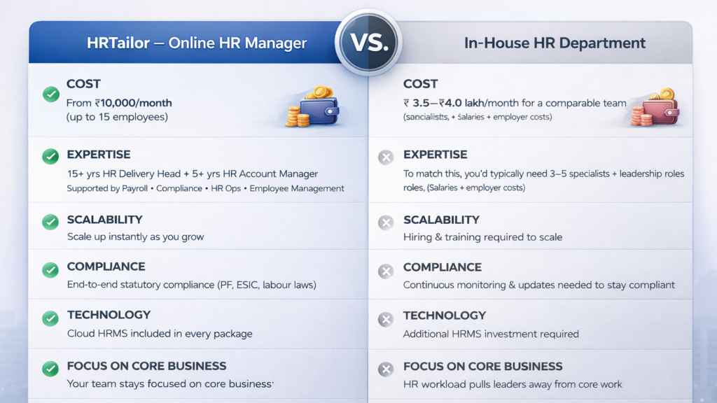 HRTailor is India’s pioneer in Online HR Services, trusted by startups, MSMEs, and businesses of all sizes. We simplify HR management, helping you set up policies, handle employee onboarding, payroll, compliance, leave, attendance, and exit management, all while ensuring compliance with labor laws.